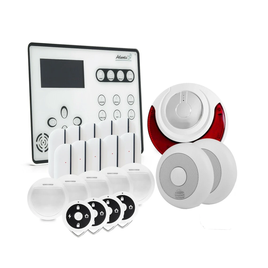 Centrale d’alarme Atlantic’S ATEOS GSM et sans fil Quantité : 1 L’ATEOS d’Atlantic’S est une centrale d’alarme de conception récente. Elle est le fruit de plus d’un an de développement. Ce système d’alarme sans fil reprend tous les attributs qui ont participé au succès des autres modèles de la marque et les enrichit de fonctionnalités nouvelles. L’ATEOS se distingue en particulier par : un système de communication bidirectionnel qui permet non seulement d’écouter les bruits ambiants autour de la centrale mais aussi d’interagir et de parler à travers son speaker intégré, des alertes paramétrables pour choisir en fonction de chaque type d’événement (détection périmétrique, détection volumétrique, batteries faibles, perte de signal GSM etc etc) comment être prévenu, c’est-à-dire : par appel téléphonique, par SMS, par notification à un centre de télésurveillance. Il est bien entendu possible de combiner ces alertes et de définir un ordre de priorité entre elles, des scénarios de déclenchement d’alarme particulièrement utiles en milieu professionnel qui autorisent par exemple de traverser une zone dans un délai imparti sans pour autant déclencher l’alarme ou encore de ne déclencher l’alarme que si des détections liées se produisent, un emplacement de carte SD pour bénéficier le cas échéant de mises à jour ou de fonctionnalités nouvelles que la marque Atlantic’S pourrait proposer, un message d’alerte personnalisable, 16 codes utilisateurs pour mieux discerner l’activité des personnes entrantes et sortantes dans le lieu protégé, un mode veille total. Bien entendu le système est entièrement sans fil (sauf alimentation électrique de certains éléments consommateur d’énergie comme la centrale ou certaines sirènes) et les différents composants communiquent donc entre eux grâce à des ondes-radio sécurisées par un protocole de codage. La transmission d’alarme téléphonique est mixte, ce qui signifie que l’ATEOS peut alerter son propriétaire à sa convenance soit via le réseau GSM (carte SIM non fournie) soit via une ligne fixe ou une box ADSL. Cette centrale d’alarme qui dispose d’une sirène intégrée, permet un armement partiel ou total et accepte jusqu’à 64 périphériques auxquels peuvent s’ajouter 8 périphériques filaires éventuels. L’ATEOS est aussi un dispositif « pet immune » et ses détecteurs ne déclenchent pas en cas de présence de petits animaux domestiques. L’ensemble de ce dispositif alarme est pilotable à distance grâce à l’application smartphone « Alarme Atlantic’S 3.0» (et suivantes) pour Androïd ou iOS disponible sur Google Play et dans l’App Store. Cette application permet d’armer partiellement ou totalement l’alarme, de la désarmer ou de connaître son statut à distance mais aussi de contrôler le port de sortie programmable et jusqu’à 8 modules domotiques. Bien entendu, tous les kits alarme ATEOS sont évolutifs et peuvent être enrichis au fil des besoins par de nouveaux périphériques. Enfin, le design de cette centrale a été particulièrement soigné. Plus petite qu’une feuille A4 et seulement épaisse de 3.5 cm elle s’intègre avec facilité et élégance dans tous les intérieurs avec son écran tactile blanc des plus réussi. 10 Détecteurs d’ouverture DO-443R Le détecteur d’ouverture pour portes et fenêtres DO-443R protège les accès et points vulnérables de votre domicile ou de votre local. Il communique en permanence avec la centrale d’alarme par liaisons radio sécurisées avec une portée maximum de 150m en champ libre (variable selon les obstacles et la configuration du lieu). Il transmet immédiatement un alerte en cas d’effraction et est équipé d’une protection anti-arrachement.